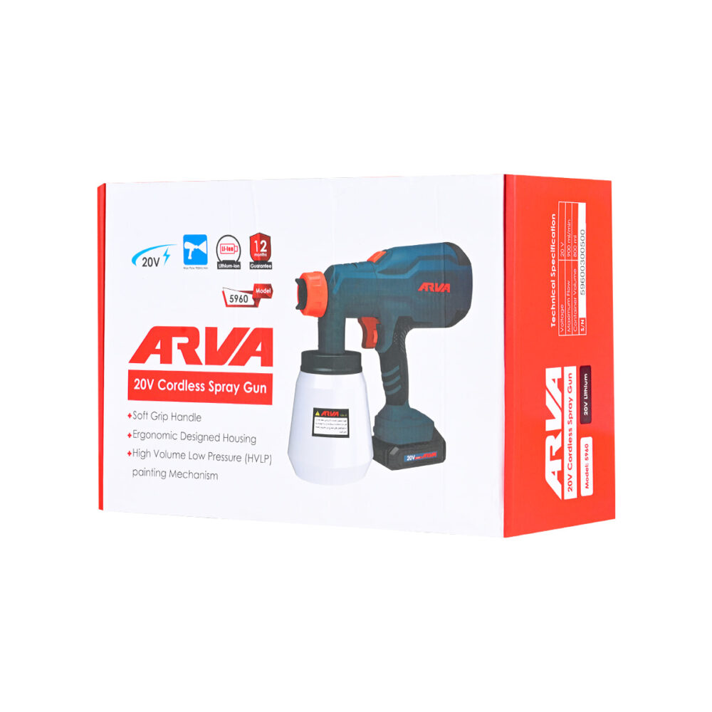 ولتاژ: ۲۰ ولت ظرفیت باتری: ۲ آمپر ساعت سرعت بی باری: ۳۷۰۰۰ دور بر دقیقه حداکثر پاشش رنگ: ۹۰۰ میلی لیتر بر دقیقه حجم مخزن: ۸۰۰ میلی لیتر مدت گارانتی: ۱۲ ماه متعلقات: ۴ عدد سری نازل، شارژر، ۲ عدد باتری ۲۰ ولت لیتیوم یونی موتور پرقدرت با راندمان و کیفیت بالاتر مجهز به مکانیزم HVLP دوستدار محیط زیست و مقرون به صرفه با بازدهی حرفه ای حداکثر و هدررفت حداقل مجهز به کلید دیمر تنظیم سرعت امکان تنظیم سرعت جریان خروجی به منظور تطبیق با فعالیت های مختلف طراحی ارگونومیک و سبک بدنه برای آزادی عمل و تحرک بیشتر طراحی ارگونومیک دسته با استفاده از روکش نرم ضد تعریق و ضد لرزش برای کاربری آسان نازل قابل انعطاف و مناسب برای کاربری های متنوع مجهز به تکنولوژی شارژ سریع دارای نشان و استاندارد CE و GS