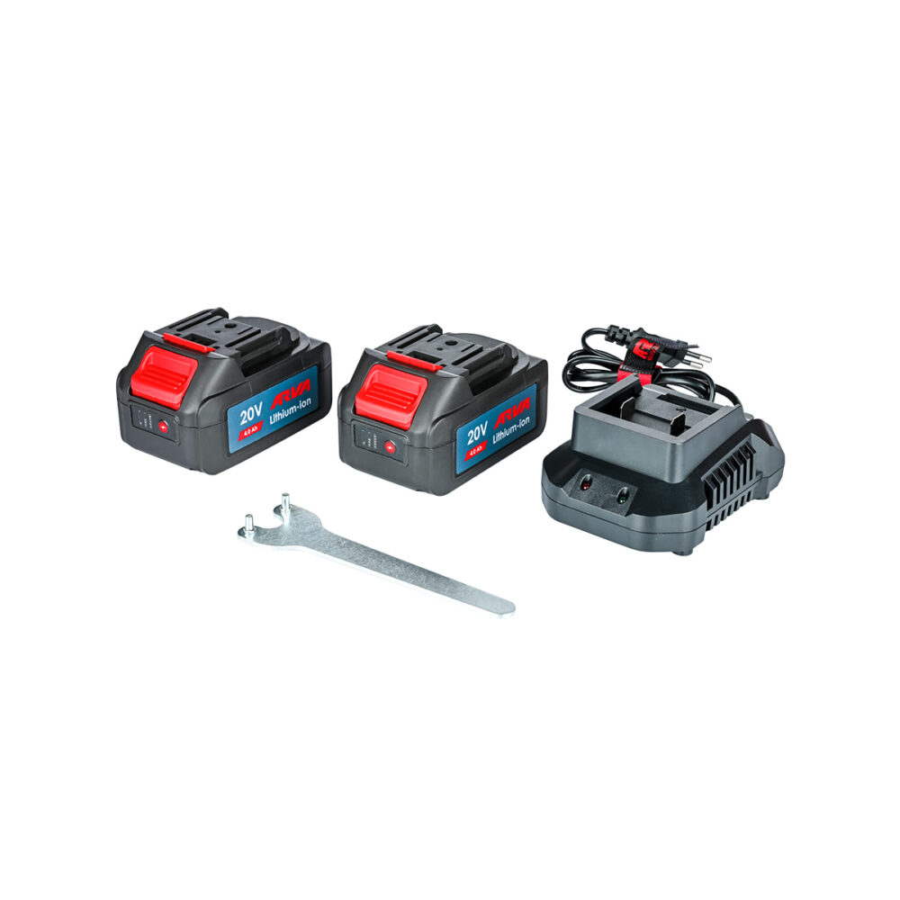 ۱ عدد دسته کمکی، آچار مهره، گارد محافظ، شارژر و ۲ عدد باتری لیتیوم یونی ۲۰ ولت ۴ آمپر ساعت